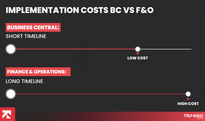 Business Central implementations may be completed within 3-6 months, whereas F&O implementations may take longer due to extensive customization.